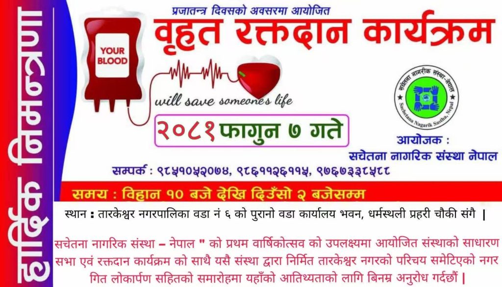 तारकेश्वर, काठमाडौं – सचेतना नागरिक संस्था नेपालले आगामी फागुन ७ गते प्रजातन्त्र दिवसको अवसर पारेर वार्षिक साधारण सभा, रक्तदान कार्यक्रम